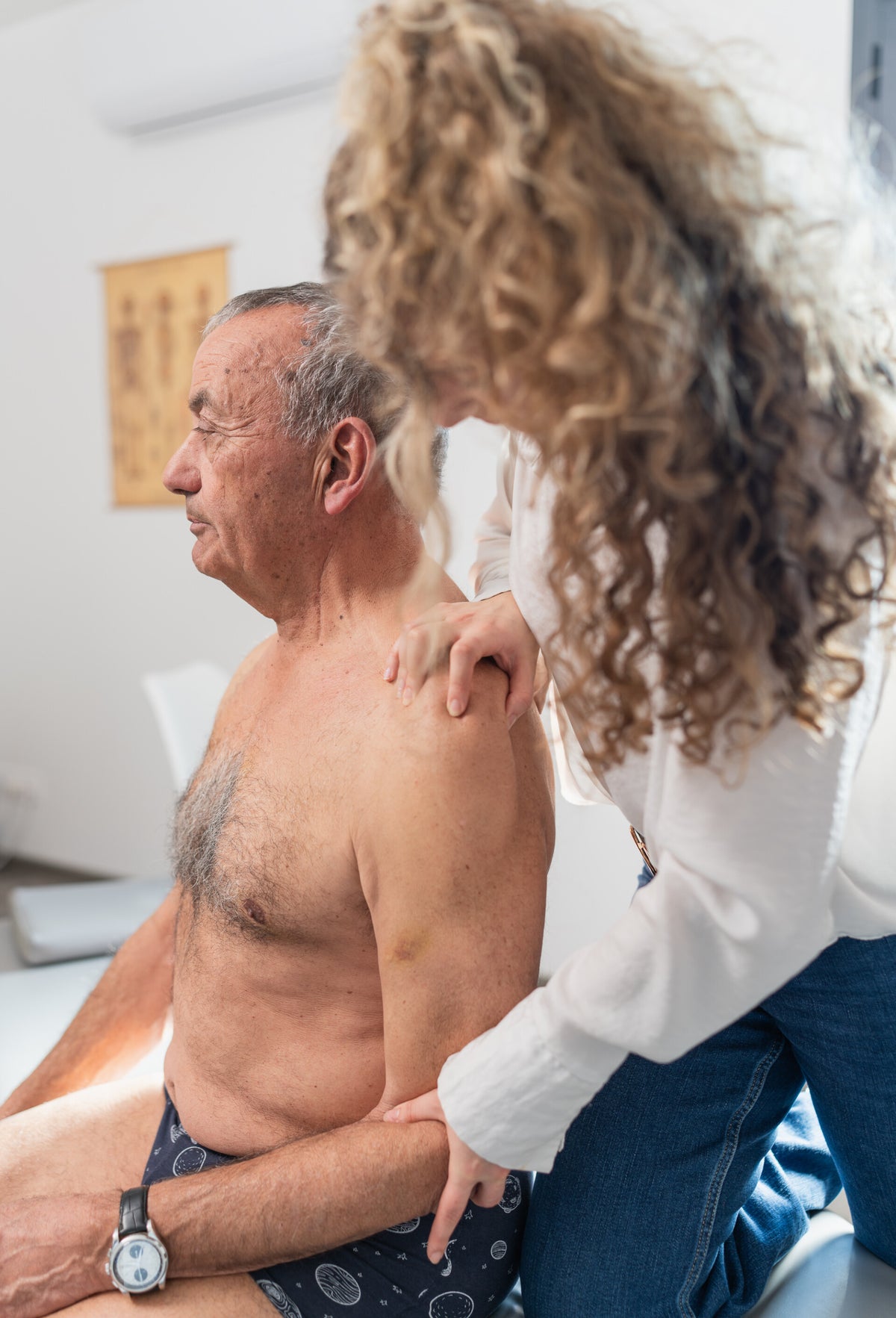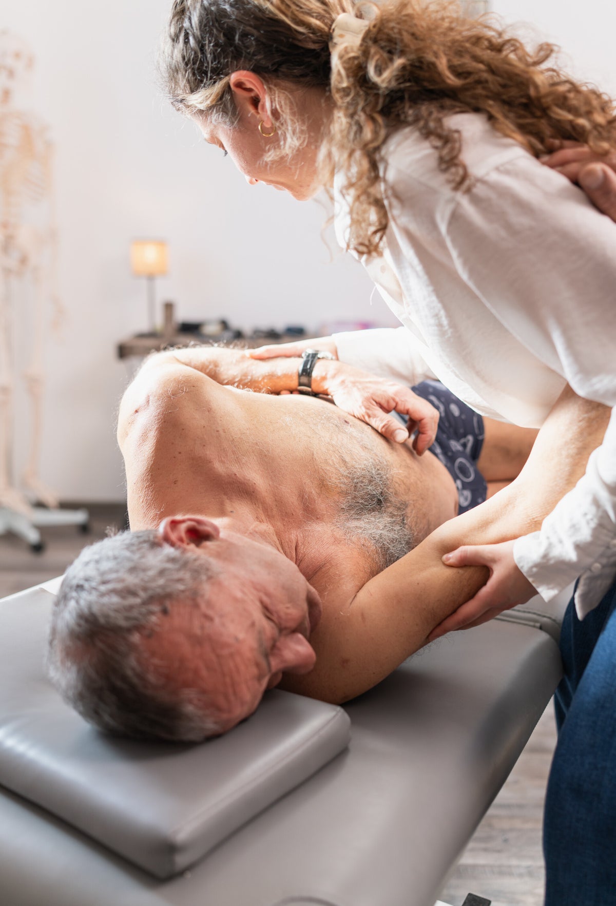 Ce deuxième monde est celui de la perte d'autonomie, ou tout du moins d'un quotidien plus difficile. Le cabinet a déjà par le passé pu suivre plusieurs centenaires. Avec les personnes âgées où la fatigue devient plus présente et se fait sentir au jour le jour, nous entrons dans une autre pratique. Il est évident que la consultation et la pratique diffèrent, dans ces cas de figures des autres consultations. Le squelette n'est plus le même, le moral, les attentes non plus. Le but dans ces cas-là n'est pas de manipuler à tout prix pour pouvoir de nouveau sauter à l'élastique ou danser toute la nuit sur les tables, mais il est d'accompagner, d'aider autant que faire se peut pour que l'autonomie et l'absence de douleur fassent de chaque jour une journée agréable et meilleure à passer. En effet lorsque l'arthrose est présente, lorsqu'une rupture de la coiffe des rotateurs est avérée, lorsque les douleurs articulaires des mains, des genoux, du dos, du cou ou encore des épaules sont présentes il faut malgré tout trouver un moyen de garder cette mobilité et de l'encourager.